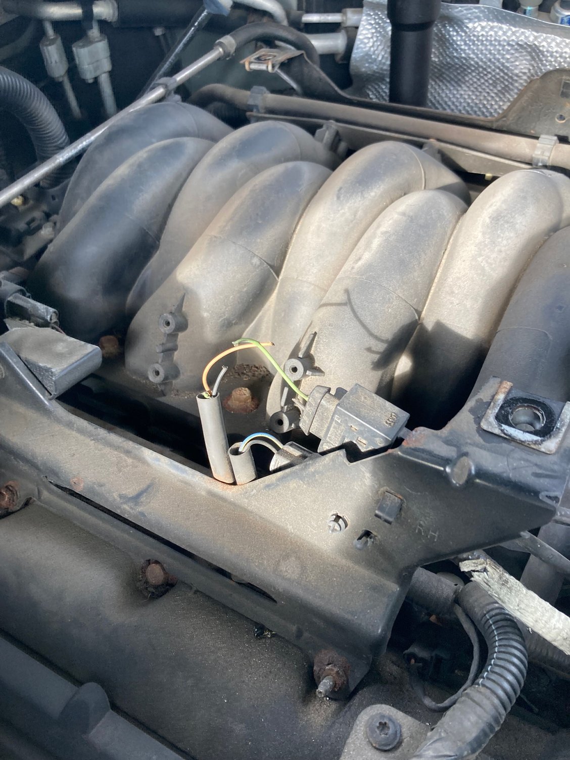 There are 4 wires, just can’t see them. They have broken at the plug and wire harness wrap. There are a total of 4 plugs on top of engine - 1 at each side front and back. This is on the passenger front side of the engine.