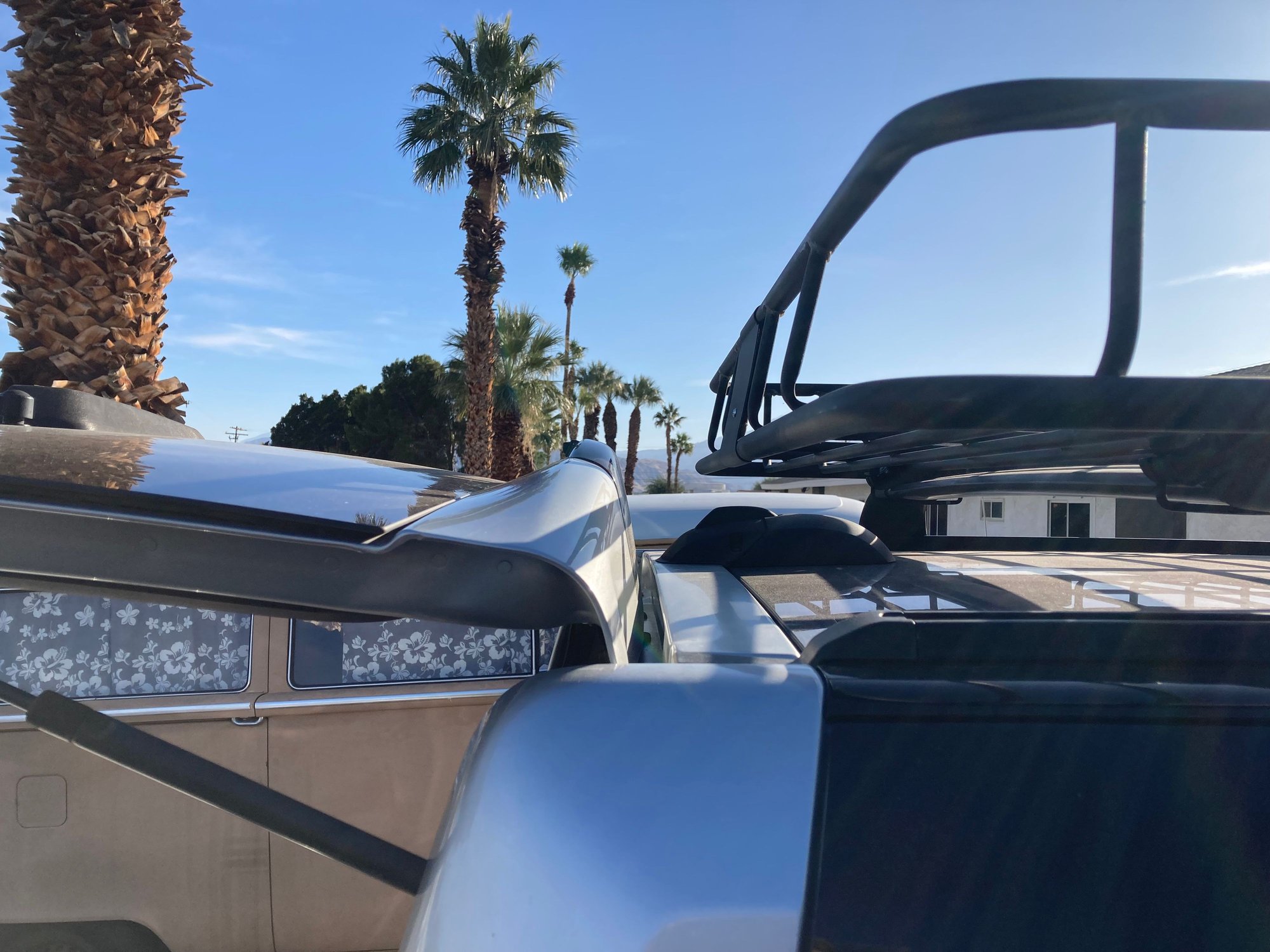 My concern is whether the AB ladder would bang into the rack when the rear hatch is raised. I can't find any photos of an LR3 with this sort of rack shot from the side to give me a sense of whether the top part of this rack would get bumped with a raised hatch. As the photo below suggests, about 5-1/2 inches now exists between the closest two points of the rack and the hatch. If you have an Arksen rank, you know that it's not possible to adjust the rack forward or backward without an insane lot of hassle, so a ladder has to work as is.