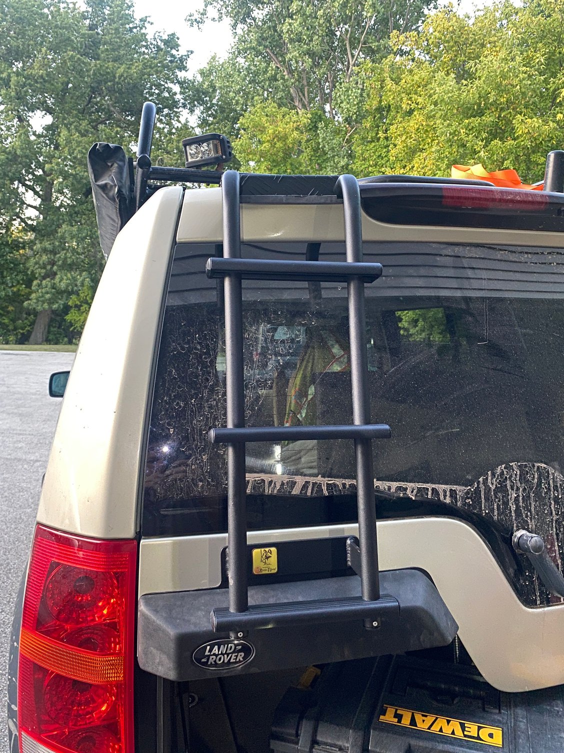 Based on what I learned here, I went ahead and bought the Atlantic British right side ladder (product code AGP780020 or VPLAR0164). I liked the extended left side models from a few vendors out there but they (a) would interfere with just dropping the lower tailgate, (b) narrowed at the top and I assumed they'd be uncomfortable, and (c) were about $150 more cash. I'm happy with what I bought and installed. No interference at all with the rack. Restriction on rear vision is minimal and anyway most times I'm using the LR3 for something fun I can't see out of the back anyway due to too much crap inside. Sturdy feel, works great with the lower tailgate down, gets me up high enough to reach to the center of the rack (anything forward of that point can be accessed by standing on the front seats), and seems like it would have a boatload of uses that have nothing to do with climbing up (lantern holder, shower bag holder, fishing pole rest, tiedown for shelters and tents on windy days, etc.
