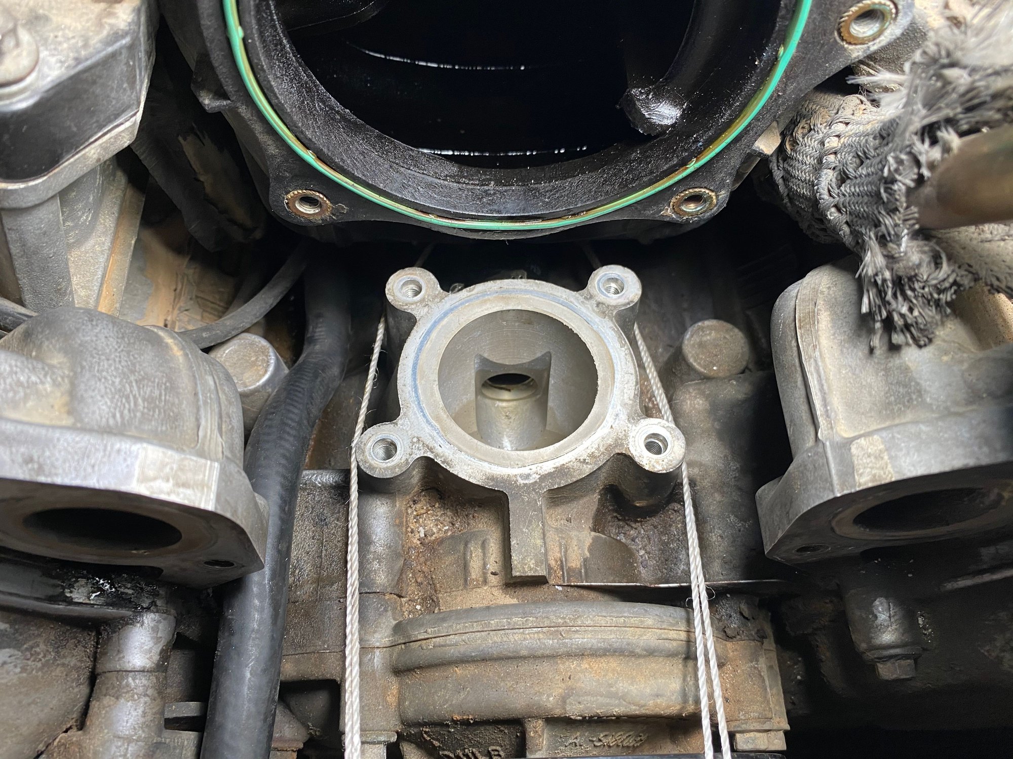 The crossover housings tend to eventually fail. Especially if not OEM. Probably cracked and running down the valley under the intake and down the back. There is also a small coolant hose right under the throttle body that loops back to the front. Mice can get to it and chew on it. IN the second pic below, you can see the opening in the aluminum. The hose is right behind there, you can barely see the clamp but the hose on the left is the same hose. Tricky to replace. You pretty much need to remove the throttle body to investigate.