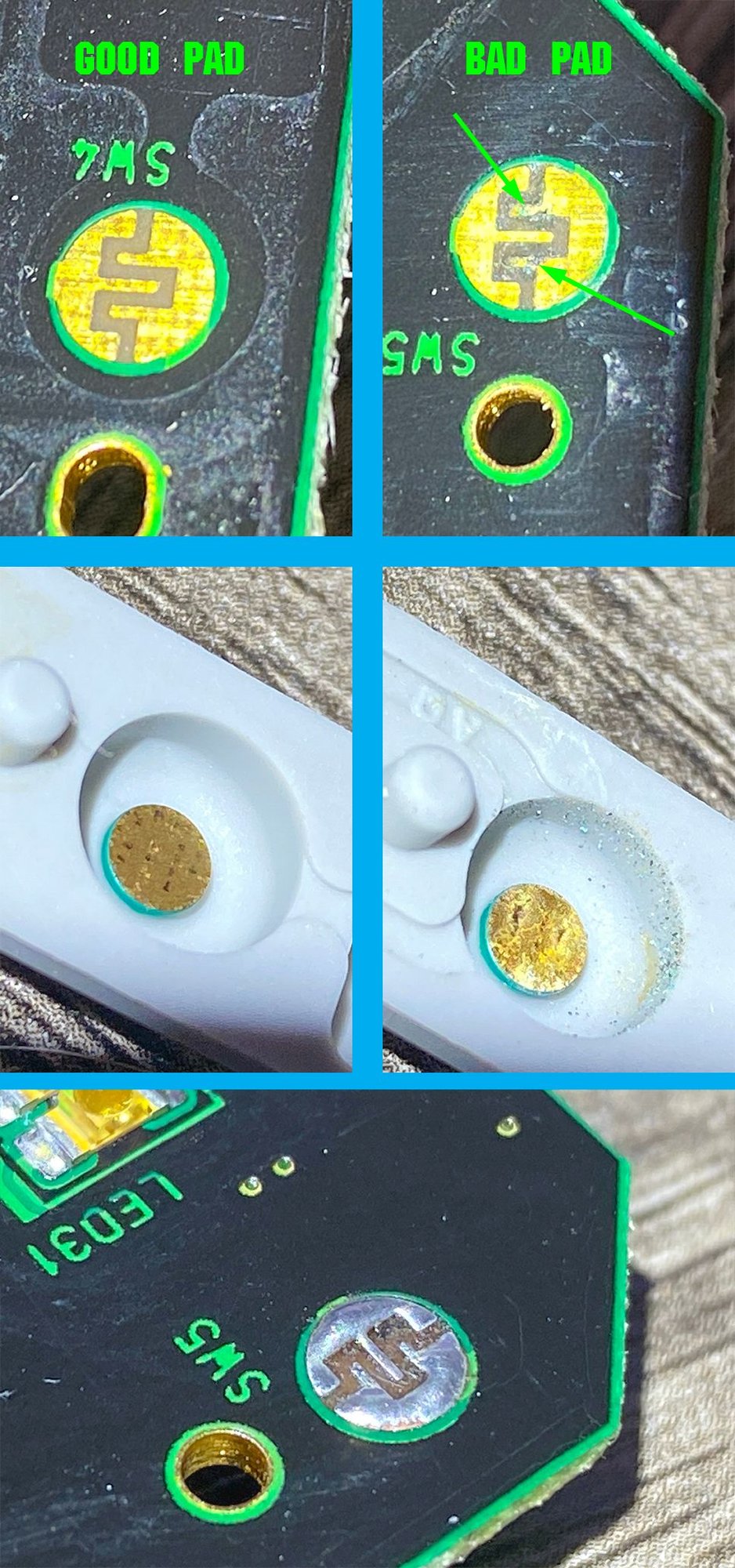 This is what I found in my "sealed" switches, corrosion. Had to flow some solder on the bad pad which seems to be hold up well. Your switch contact pad may be corrosion welded onto the PCB pad.