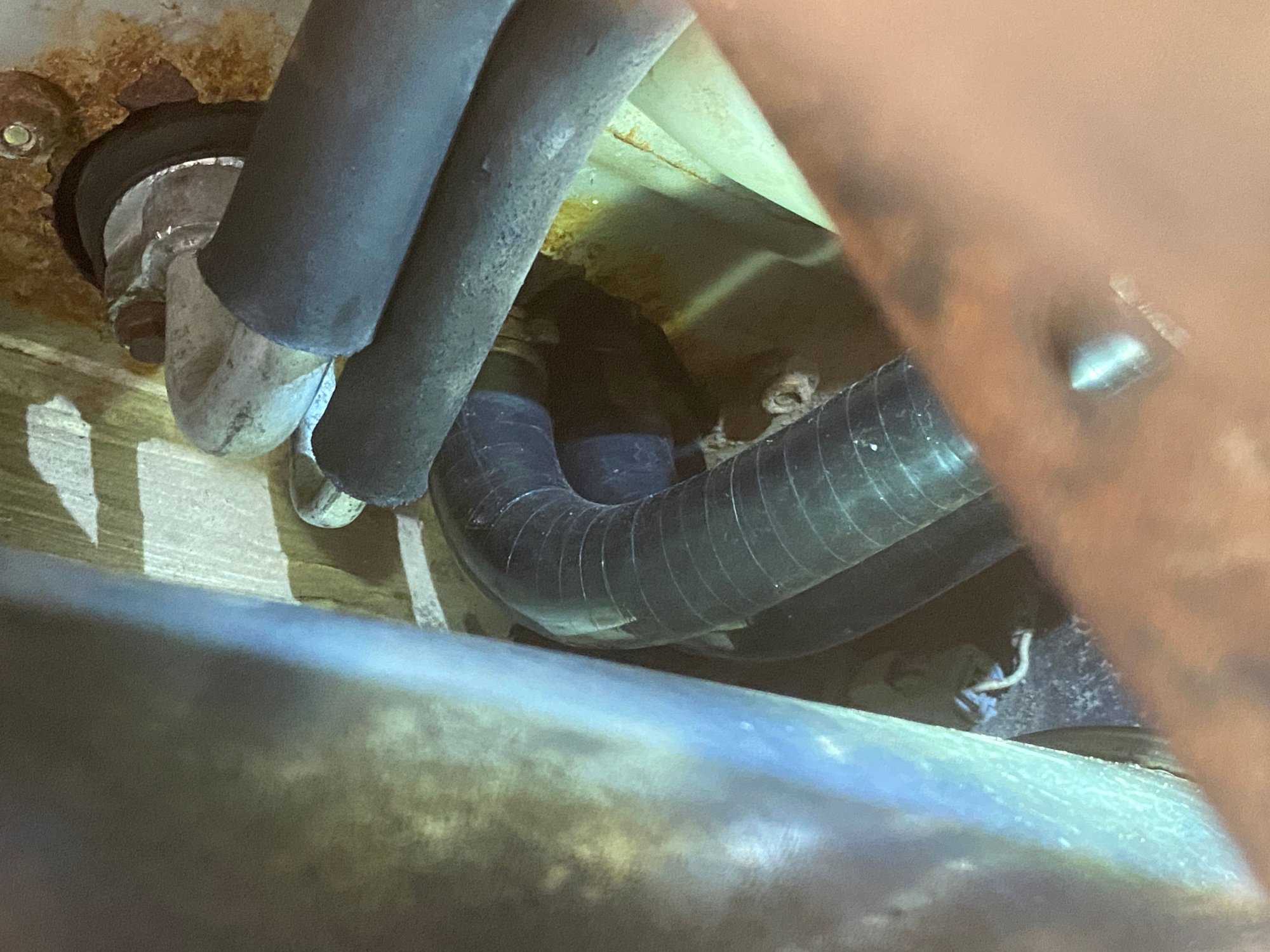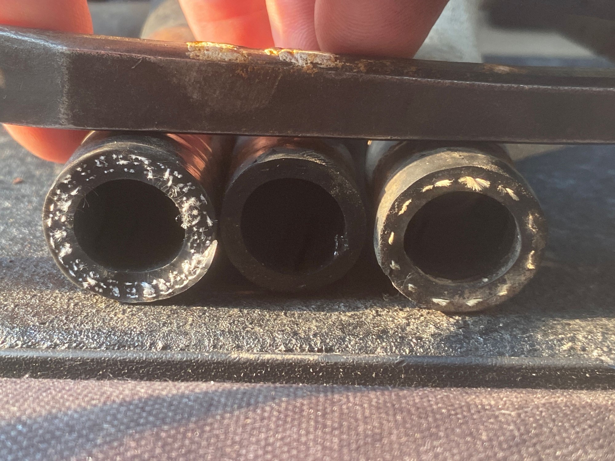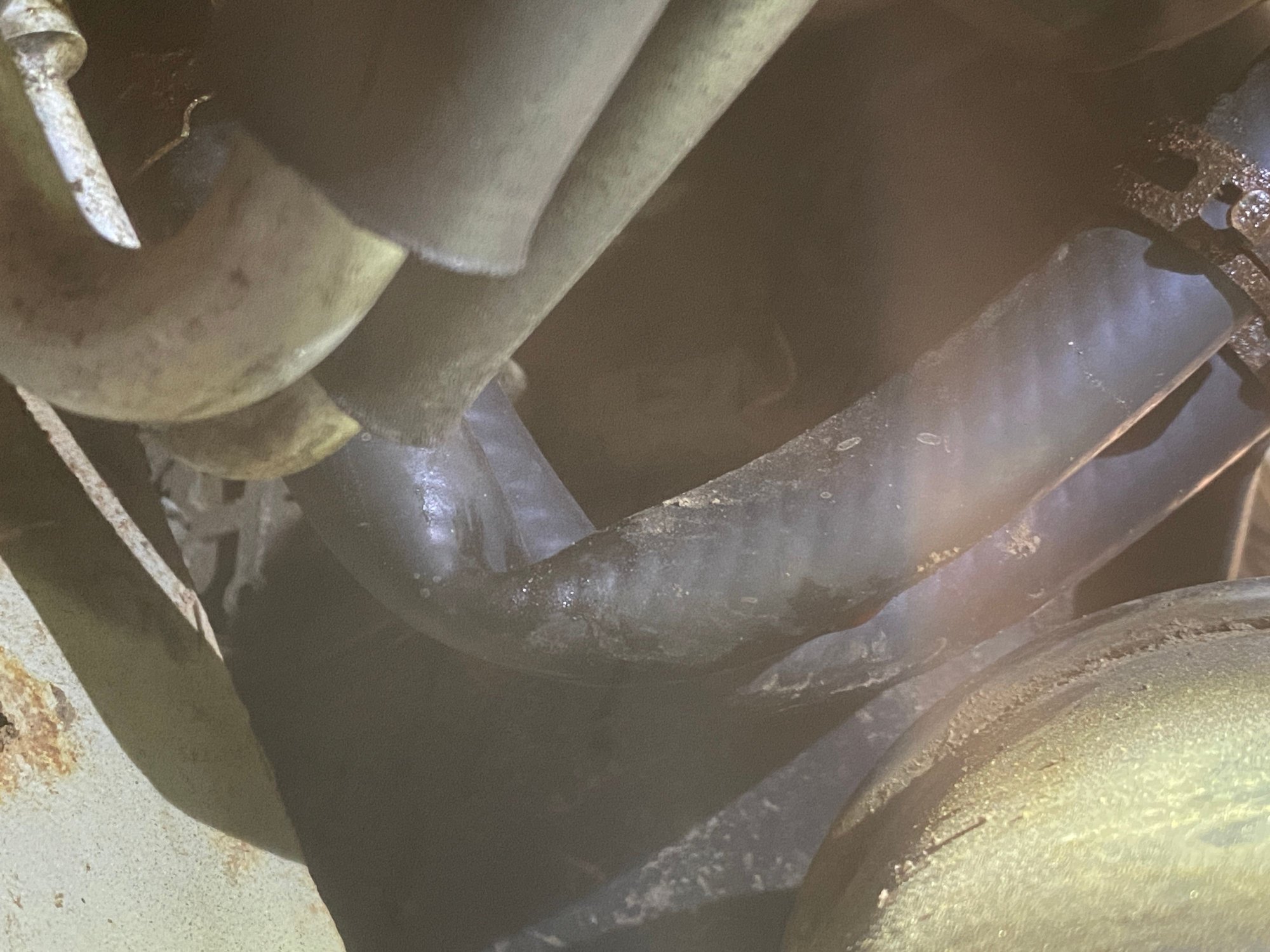 Today I dug into it and indeed, each end of both hoses was leaking a little but because of the muffler I did not notice that the hoses had a pretty good kink to em! Glad I ordered the pre-bent hoses. I could have ordered the OEM hoses for about $80 shipped. The ones I bought were about $24 USD for a pair. The issue was the wall thickness of the Sioux Chief brand. Bad pic, but you can sorta see the OD is less than the originals and Amazon replacements. Because of that the clamps just did not have enough pressure on them.