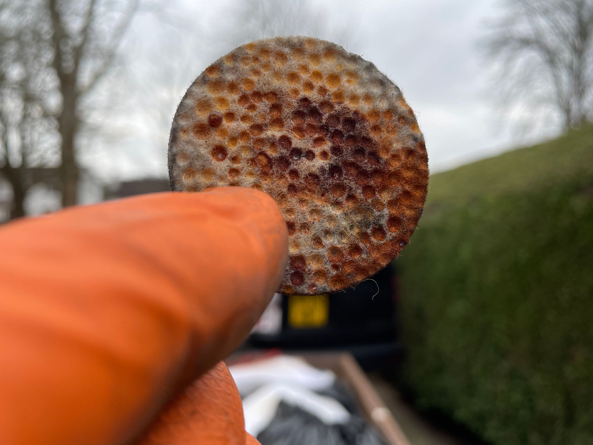 I stripped off the Dunlop unit from the LR4 today. With side rails on the chassis that was a laugh. Anyway I checked all the pipework I could see and its all fine. With the pump on the bench I dismantled the exhaust valve, and checked the o rings. Saw no issues there. I stripped off the dryer and that's where the issue is. Rust! In fact for a 6 year old vehicle with only 70k on the clock the amount of rust underneath was a disgrace. Above the pump acoustic housing the rust is beyond surface but not structural. Rust converter painted on the area after wire brushing. Anyway the desiccant is rust coloured and welded to the first filter. That filter is impenetrable! Sadly rusty water has gone into the piston cylinder. I could barely get air through the solid filter with my airline.