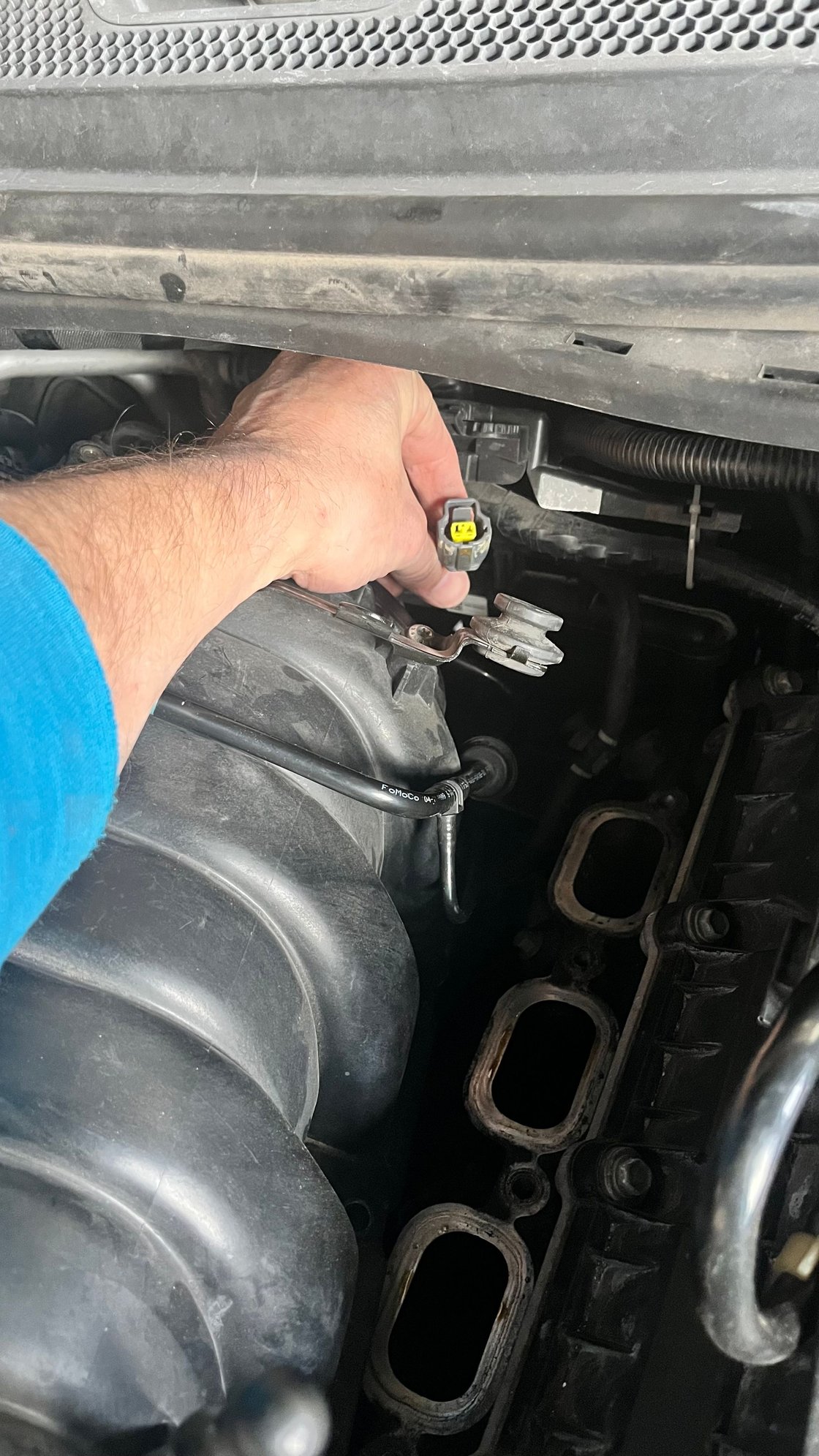 Remove the bolts from the fuel rail supply on the passenger side. GENTLY wedge fuel rail to remove the bolt. I used a rubber doorstop.