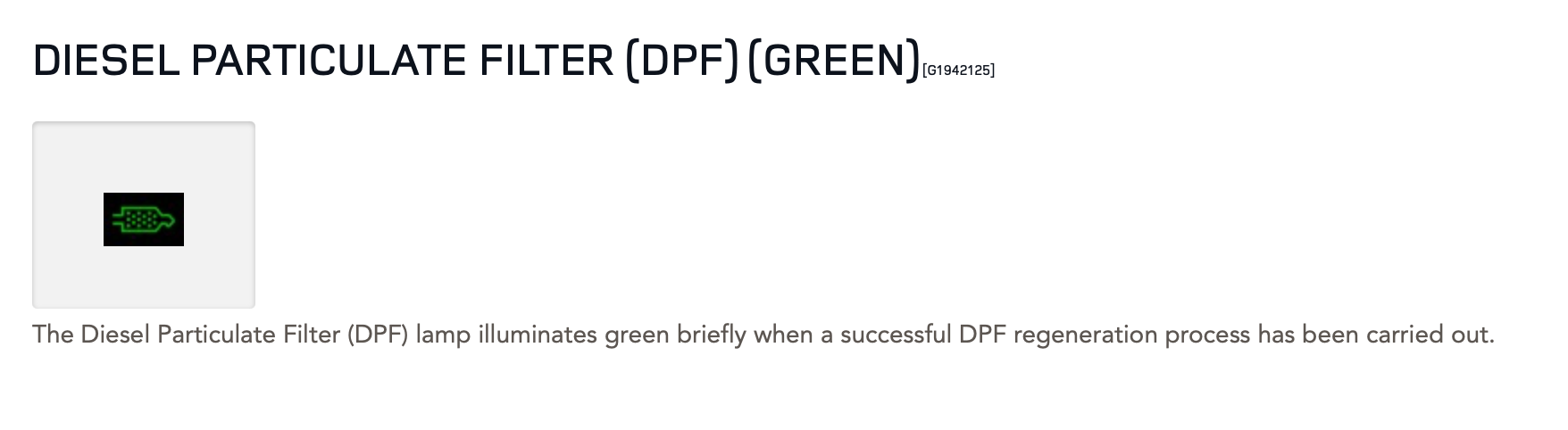 Im dealing with an engine issue on my 2018 Land Rover discovery TDV6 and without going into all the details on this thread, I'm curious what lights come on the dash related to the DPF regen. From the manual, a green icon would say a cycle was completed and red would say it didn't complete or there is an issue with the system.