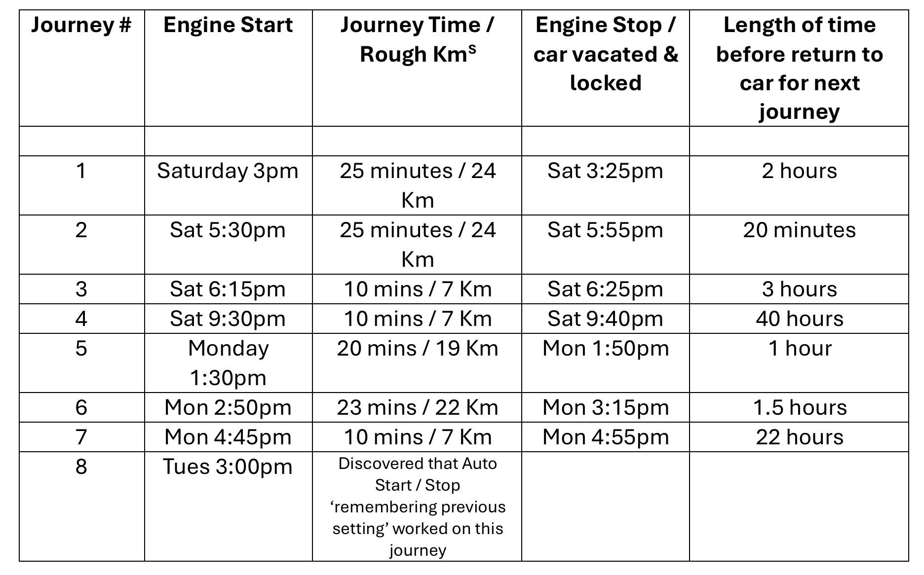 It didn’t work initially but worked on Journey #8 after the editing. Here is the information about the car’s activities between completing the edit and the Auto Stop / Start to ‘remember previous setting’ working. Many May find this info helpful