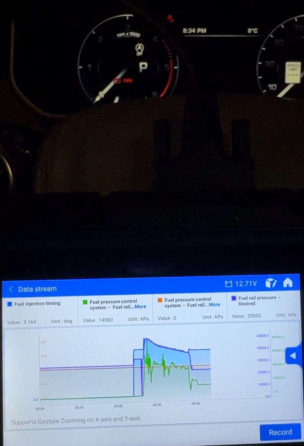 When monitoring actual fuel pressure vs desired, I'm seeing a lot of variation on bank A along with the sensor reading fluctuating between 220 and 660 kpa with the engine completely off. It also looks like the fuel pressure never quite reaches the desired pressure.