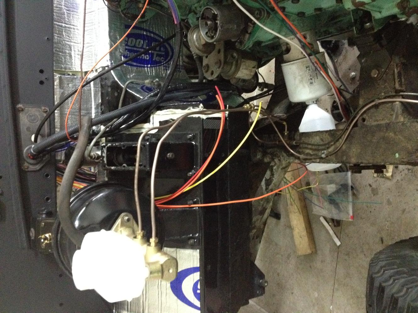 After a few decades of hard use the original frame needed replacement, which is how I got it to where it is today. I purchased a galvanized frame for it and began the swap, during this time I developed a dreaded disease that cripples many projects like this: ship fitters disease. When it set in i went around trying to fix or upgrade every little thing I could think of on the truck. I will try to sum all the work I have done here: removed rot from bulkhead and POR15'd it, truck bed liner used on bulkhead, sound deadening and vibration reducing matting added, new brake lines, new master cylinder, new turn signals, all previous wiring removed and fitted for a wiring harness, Defender seats with new foam and covers, seat heaters, waterproof seat covers.